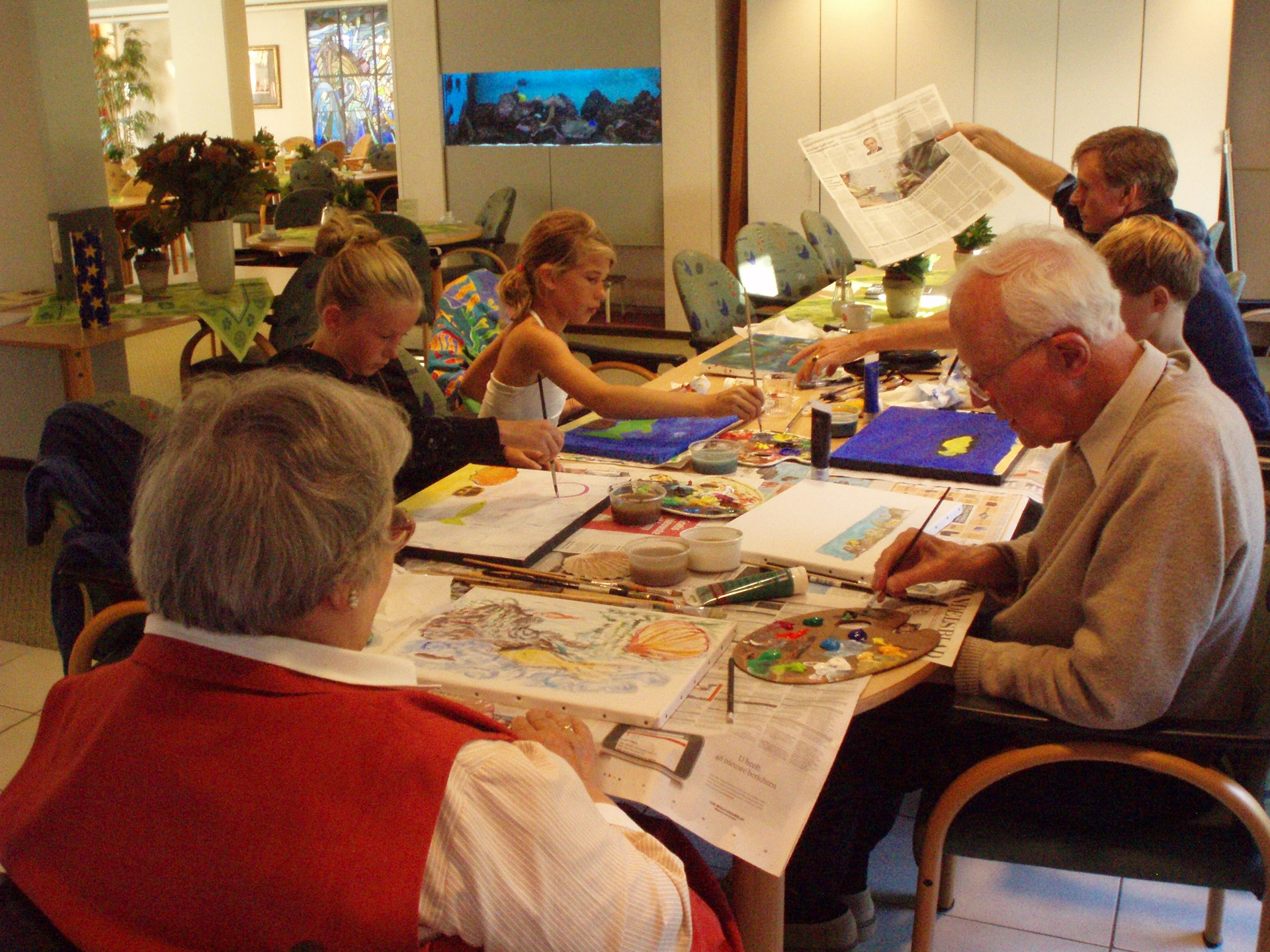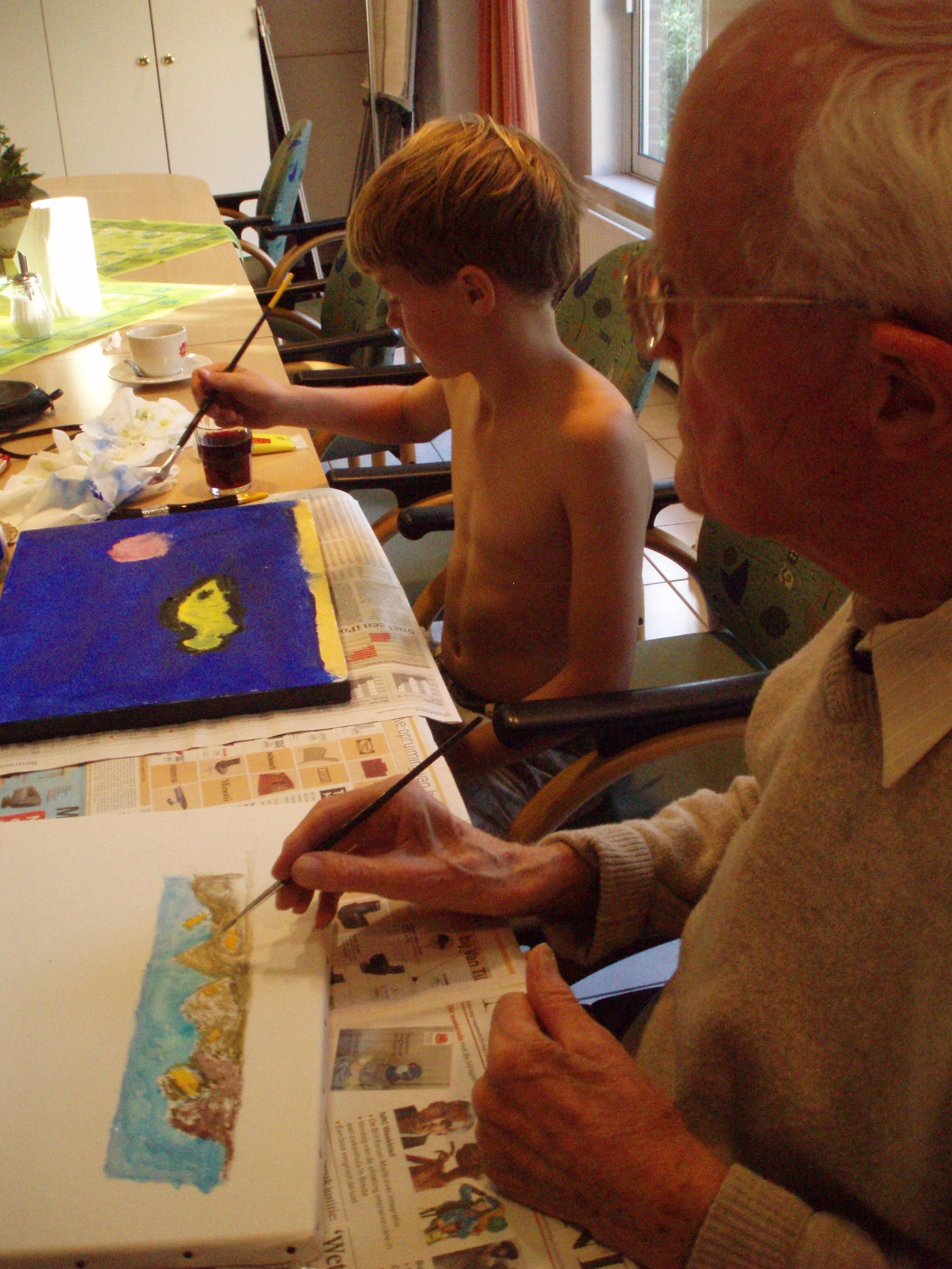 Met het groepje ouderen en jongeren met wie je gaat schilderen – of vooraf- koop je een aantal eenvoudige schilderdoeken van 40 x 60 cm of 60 bij 80 cm en verschillende kleur acrylverf ( rood, wit blauw, zwart groen en geel). Stichting Creatief Onderwijs betaalt de lijsten, de kwasten en de verf en je kan aan de slag! Voor ieder duo heb je een doek die een jongere en een oudere SAMEN gaan beschilderen. Eerst denken ze samen na over het onderwerp dat ze willen gaan schilderen, bijvoorbeeld iets in de natuur. Dan zitten ze beiden aan een eigen kant van het doek en beginnen te schilderen. Tussendoor kijken ze naar elkaars productie en proberen ze samen er tijdens het schilderen een eenheid van te maken: bijvoorbeeld door van kant te wisselen en de verschillende stijlen daardoor met elkaar vermengd worden. Zorg er dus voor dat je aan het einde een GEHEEL hebt van een AF product en niet een onevenwichtig schilderij. Het schilderij wordt verloot tussen de jongere en de oudere!