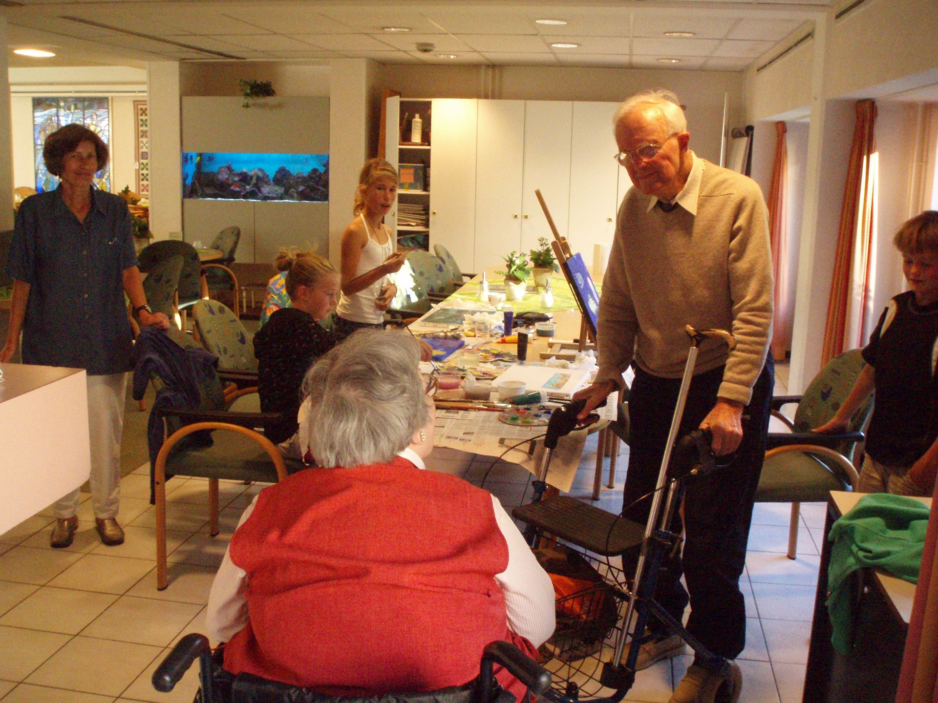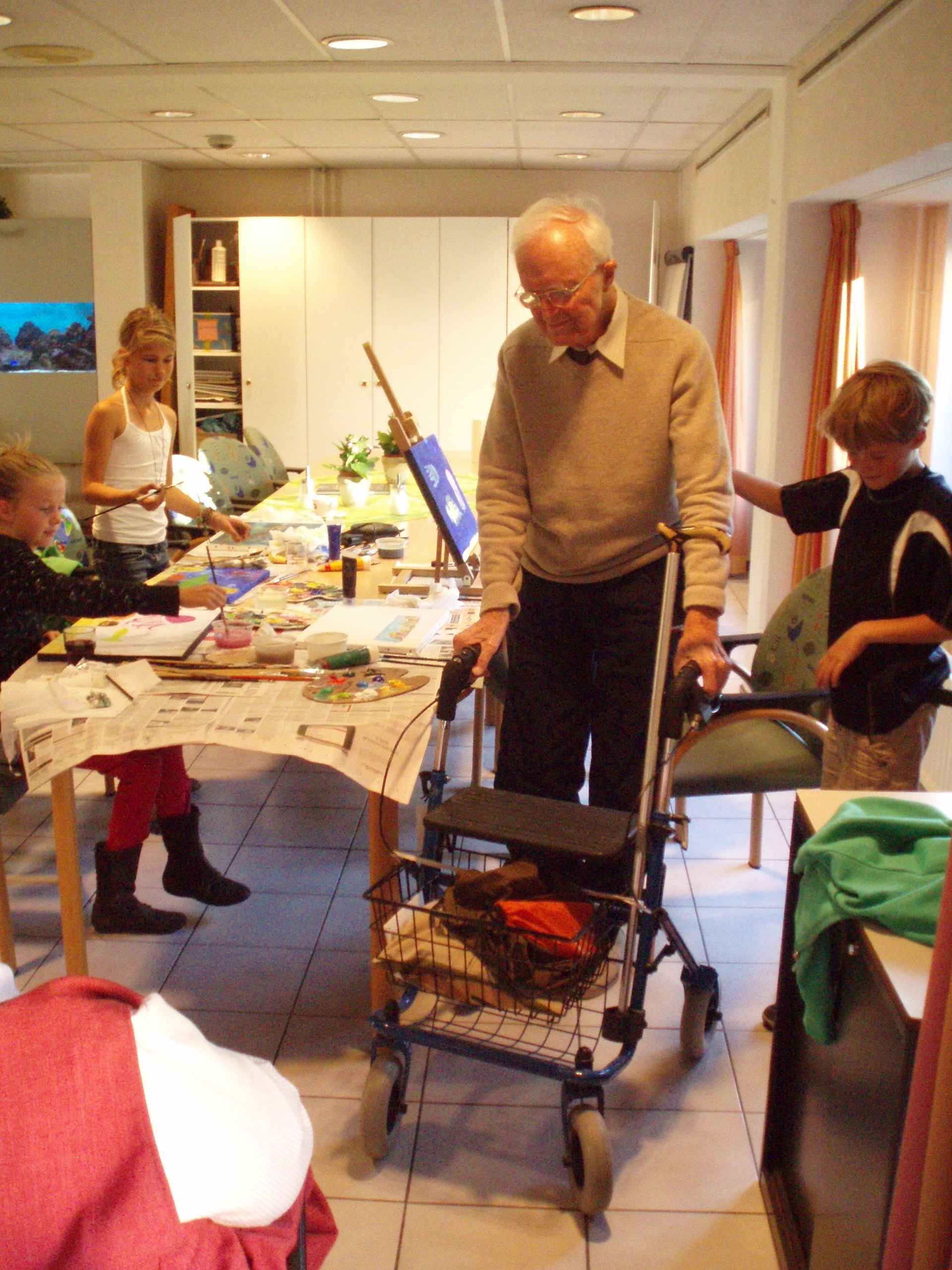 Met het groepje ouderen en jongeren met wie je gaat schilderen – of vooraf- koop je een aantal eenvoudige schilderdoeken van 40 x 60 cm of 60 bij 80 cm en verschillende kleur acrylverf ( rood, wit blauw, zwart groen en geel). Stichting Creatief Onderwijs betaalt de lijsten, de kwasten en de verf en je kan aan de slag! Voor ieder duo heb je een doek die een jongere en een oudere SAMEN gaan beschilderen. Eerst denken ze samen na over het onderwerp dat ze willen gaan schilderen, bijvoorbeeld iets in de natuur. Dan zitten ze beiden aan een eigen kant van het doek en beginnen te schilderen. Tussendoor kijken ze naar elkaars productie en proberen ze samen er tijdens het schilderen een eenheid van te maken: bijvoorbeeld door van kant te wisselen en de verschillende stijlen daardoor met elkaar vermengd worden. Zorg er dus voor dat je aan het einde een GEHEEL hebt van een AF product en niet een onevenwichtig schilderij. Het schilderij wordt verloot tussen de jongere en de oudere!