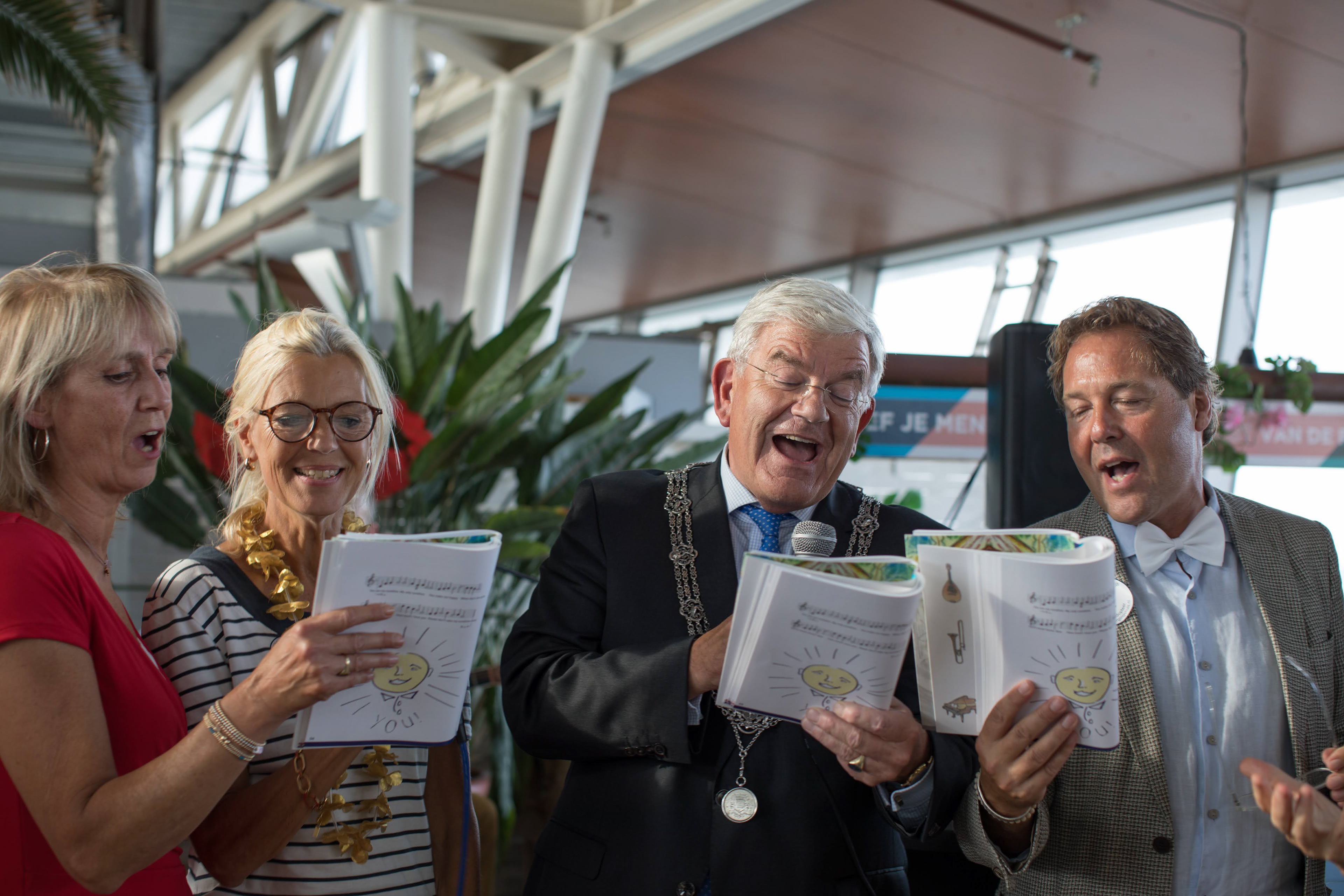 Je laat de muziek luid en feestelijk afspelen en zingt mee of probeert in ieder geval zo goed mogelijk mee te zingen maar de muziek uit de box doet dus al het werk! Je deelt een aantal muziekbundels uit aan de bewoners van het verzorgingshuis en aan de leerlingen van de school, die mee kunnen zingen aan de hand van de zangbundel. Je gaat zelf vrolijk gekleed in een kleur die jou aanspreekt en vraagt wat vrienden en vriendinnen om mee te komen zingen. Gewoon voor het plezier; de muziek van de cd wordt afgespeeld dus je hoeft zelf niet te kunnen zingen! Het gaat om het plezier dat je samen eraan beleeft. Als je wat eenvoudige muziekinstrumenten in huis hebt zoals een tamboerijn of trommel of triangel ofzo is dat leuk om die mee te nemen en op de tafels te leggen om mee muziek te maken. Beweeg/ Dans een beetje met de muziek mee als die afgespeeld wordt; dat werkt aanstekelijk voor jong en oud om mee te gaan doen! Na ongeveer 3 kwartier verzamel je weer de zangbundels bij elkaar, te gebruiken voor een volgende keer! Sing Along deel 1 en deel 2 - Zie hieronder - kunnen ook geprint worden als PDF's .